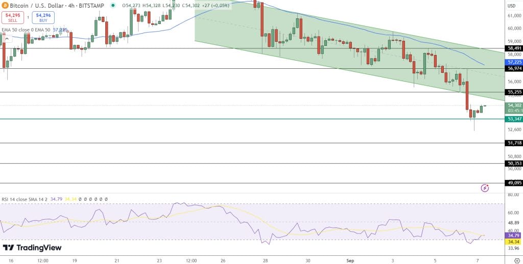 - 立即阻力位在55,250美元,支撐位在53,350美元。