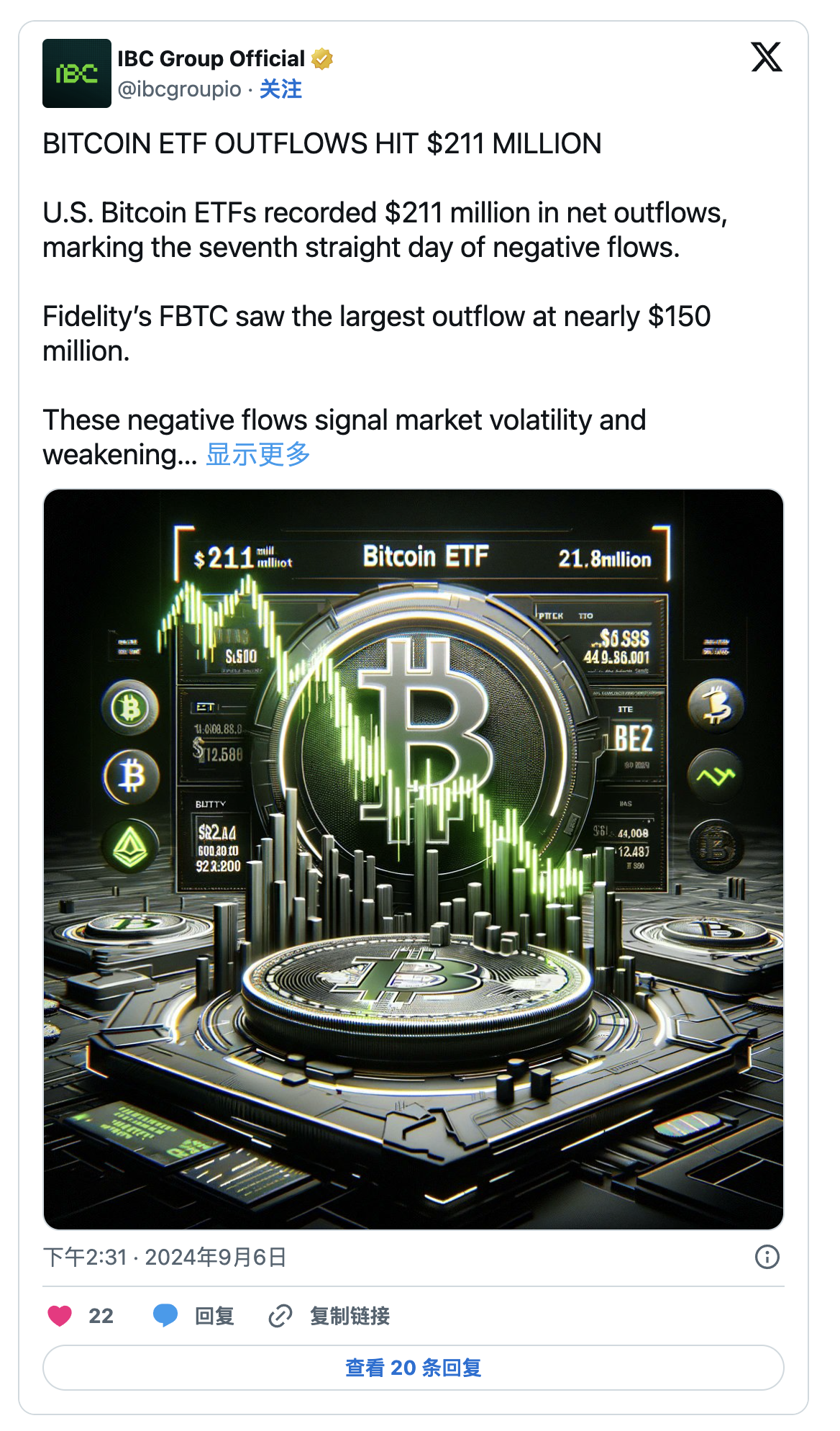 IBC Group的推文總結了這一情況,指出比特幣ETF的資金流出突顯了市場波動性增加和投資者信心減弱。