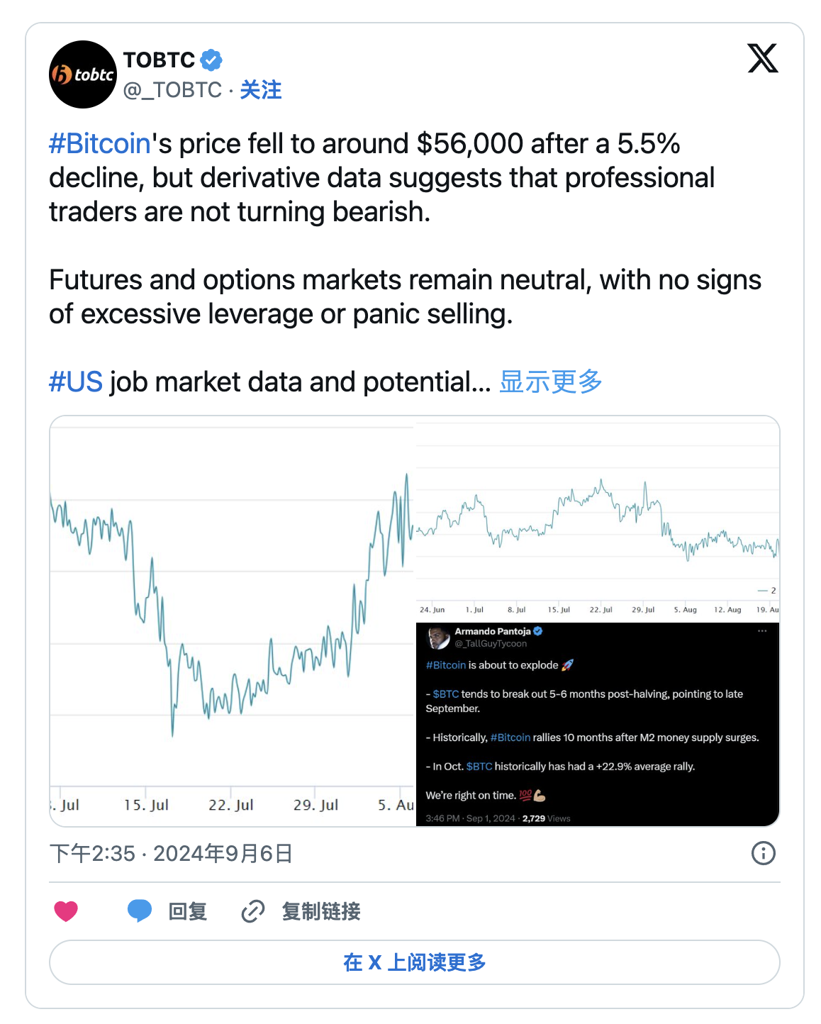 此次大幅下跌由美國就業數據不及預期引發,數據顯示8月新增就業崗位少於預期。對經濟可能放緩的擔憂使投資者避開比特幣等高風險資產。