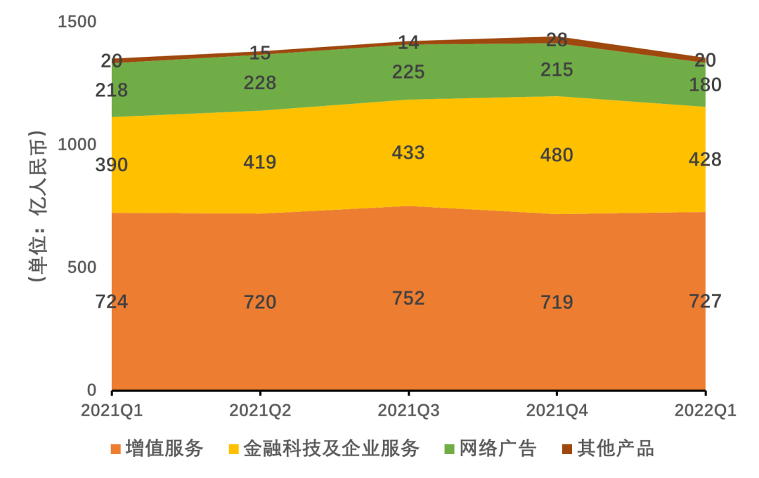 2021年Q4,金融科技與企業服務收入達到479.58億元,首次超過遊戲收入,佔總營收比例升至33.26%。不過在2022年Q1,To B業務的營收環比下降10.8%,遊戲業務再度重回營收佔比第一的寶座。