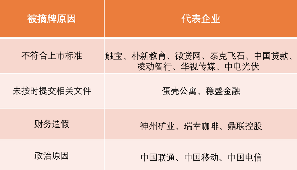 被摘牌強制退市的企業中,多數都因為不符合在持續30個交易日內保持至少1500萬美元的平均市值的上市標準,或收盤價最近連續30個工作日低於每股1美元;也有部分企業因沒有按時提交SEC要求的相關文件或被發現財務造假;還有部分是出於政治原因。