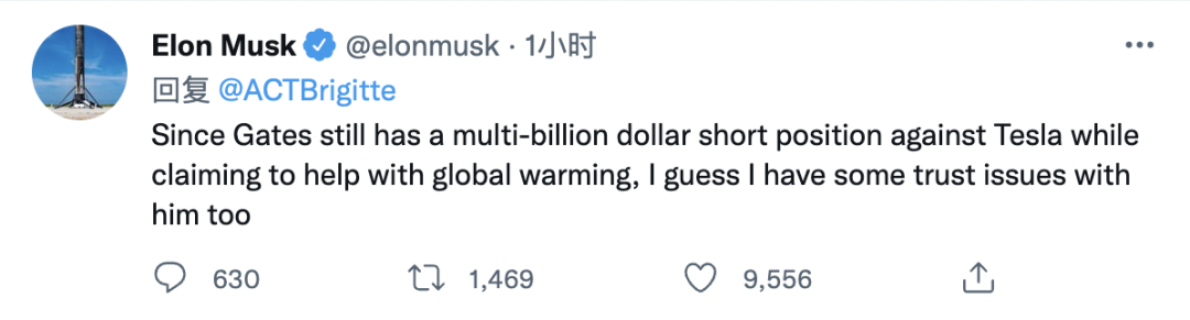 他表示,蓋茲一邊聲稱要幫助解決全球變暖問題,一邊還“數十億美元”做空特斯拉,“我想我對他有一些信任問題” 。粉絲詢問比爾·蓋茲的空頭頭寸如何從”5億美元“增加到”數十億美元“,馬斯克回應稱,原來是5億美元,但後來特斯拉漲了很多,所以現在要花15億到20億美元才能了結。