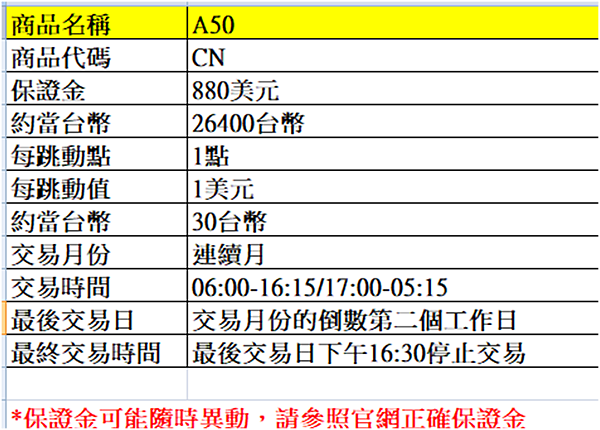 除了代表性以及波動度外,A50指數期貨合約設計,規格小,所需保證金多在1000美金以下,對於小資族投資人來講交易門檻低、交易手續不費力,更加上臺灣投資人向來對一海之隔的大陸股市情有獨鍾,也因此成為國人最愛的海期商品之一。
