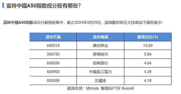 富時中國A50指數成分股涵蓋金融、地產、電信、消費服務及工業等各個產業,其中以金融相關產業比重最高,下表為前十大成分股: