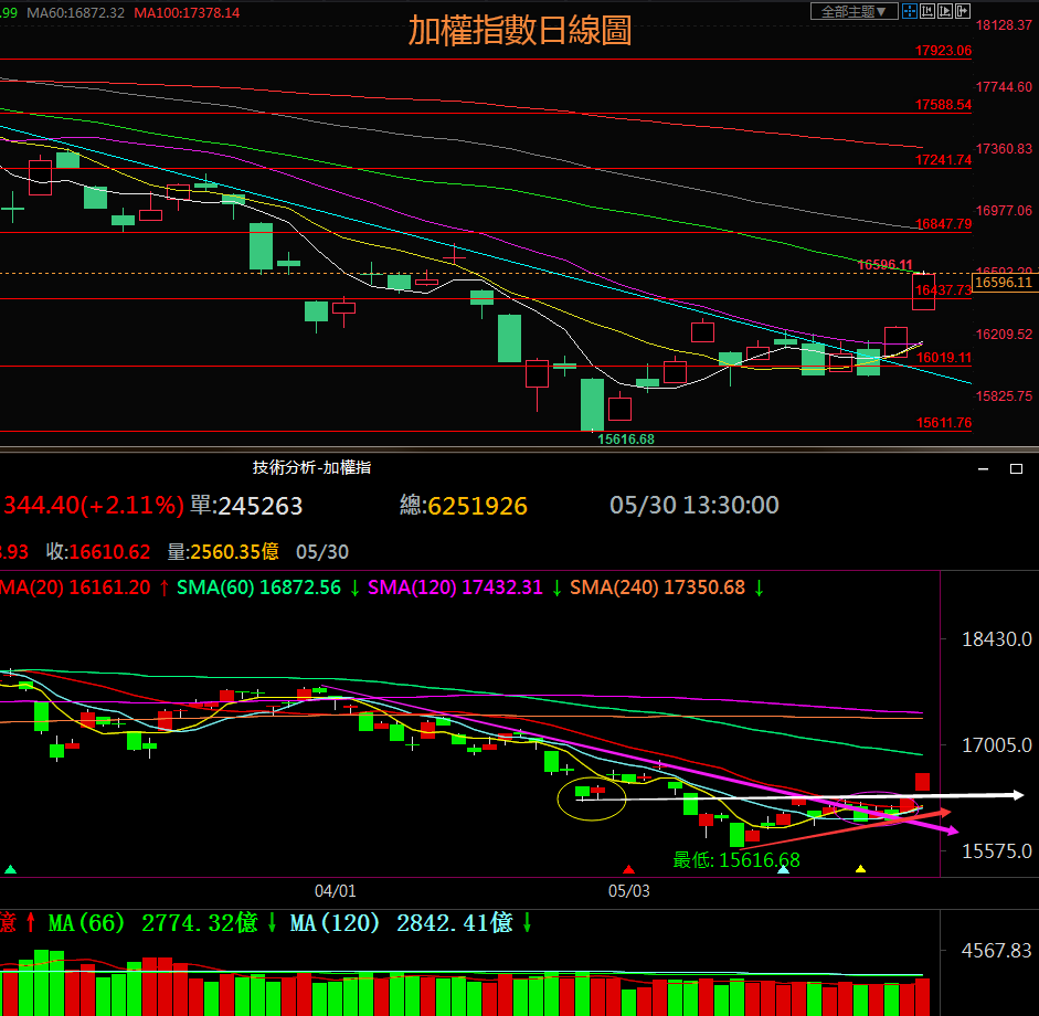 5月30日週一加權指數受上週五美股大漲激勵開高走高,放量跳空再次開出一根光頭光腳的大實體紅K棒;後市將延續反彈走勢,作用於上方壓力區16850~16985附近,等待方向選擇。4月份月線收線收於月線級別多空分界位16300上方的16592.18點,5月30日放量收復20月均線位16572,後市大概率維持觸底後的反彈上行走勢。日線形態上看加權指數已經放量突破16575將進一步構建頭肩底底部看漲形態。週線上看,加權指數前面兩週上行測試5週均線位均縮量收出偏整理形態的小實體陽線,本週週一跳空突破5週均線位;目前放量突破16575多空分界位將打開新的上行空間走出今年1月份以來持續5個月下跌走勢的底部。MACD指標綠色柱狀線創兩年以來的新低後持續縮小中,相對強弱指標短期RSI下破50中軸線幾長期RSI持續震蕩下行創兩年以來的新低後於超賣區延續上拐,目前多數技術指標超賣後進一步展開修復,後市只要放量上破壓力區16850~16985,日線級別將轉為強勢區運行,週線級別將進一步反彈上行,遠離今年5月份的底部區域結束今年的下跌走勢。目前上方壓力區為16850~16985,多空分界位為16985,下方支撐區為16300~16440,下方多空分界位為16300。