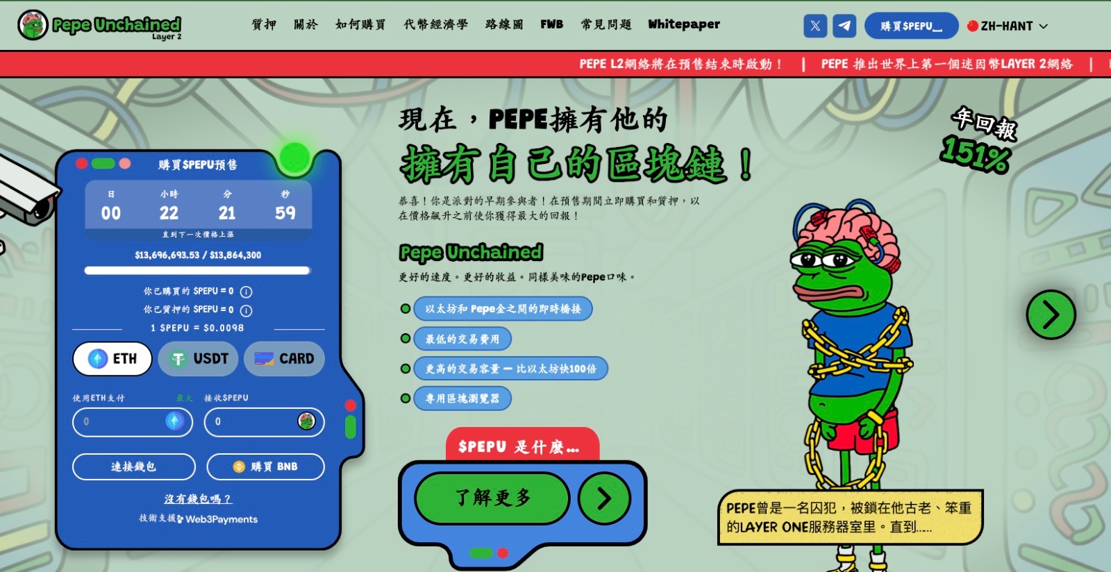 在區塊鏈技術不斷發展的今天,迷因文化與加密貨幣的結合已經成為一種趨勢。 Pepe Unchained ($PEPU) 正是在這種背景下應運而生的一款新興加密貨幣。它不僅通過迷因的趣味性吸引了大量關注,還通過Layer 2區塊鏈技術提供了卓越的交易體驗和高收益的質押機會。