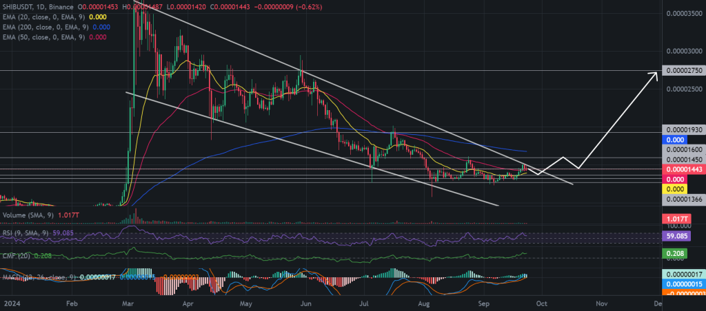 然而,仔細觀察柴犬幣的價格圖表表明,這可能只是更廣泛看漲趨勢中的一個小挫折。值得注意的是,今日的價格走勢確認了自3月以來形成的看漲下降楔形態,特徵是價格呈現一系列較低的高點和較低的低點,表明價格正在向突破點匯聚。