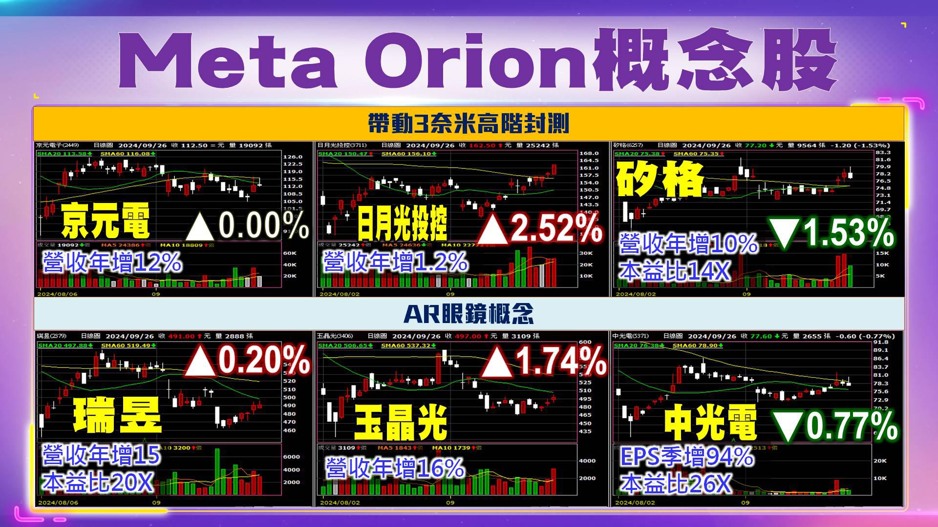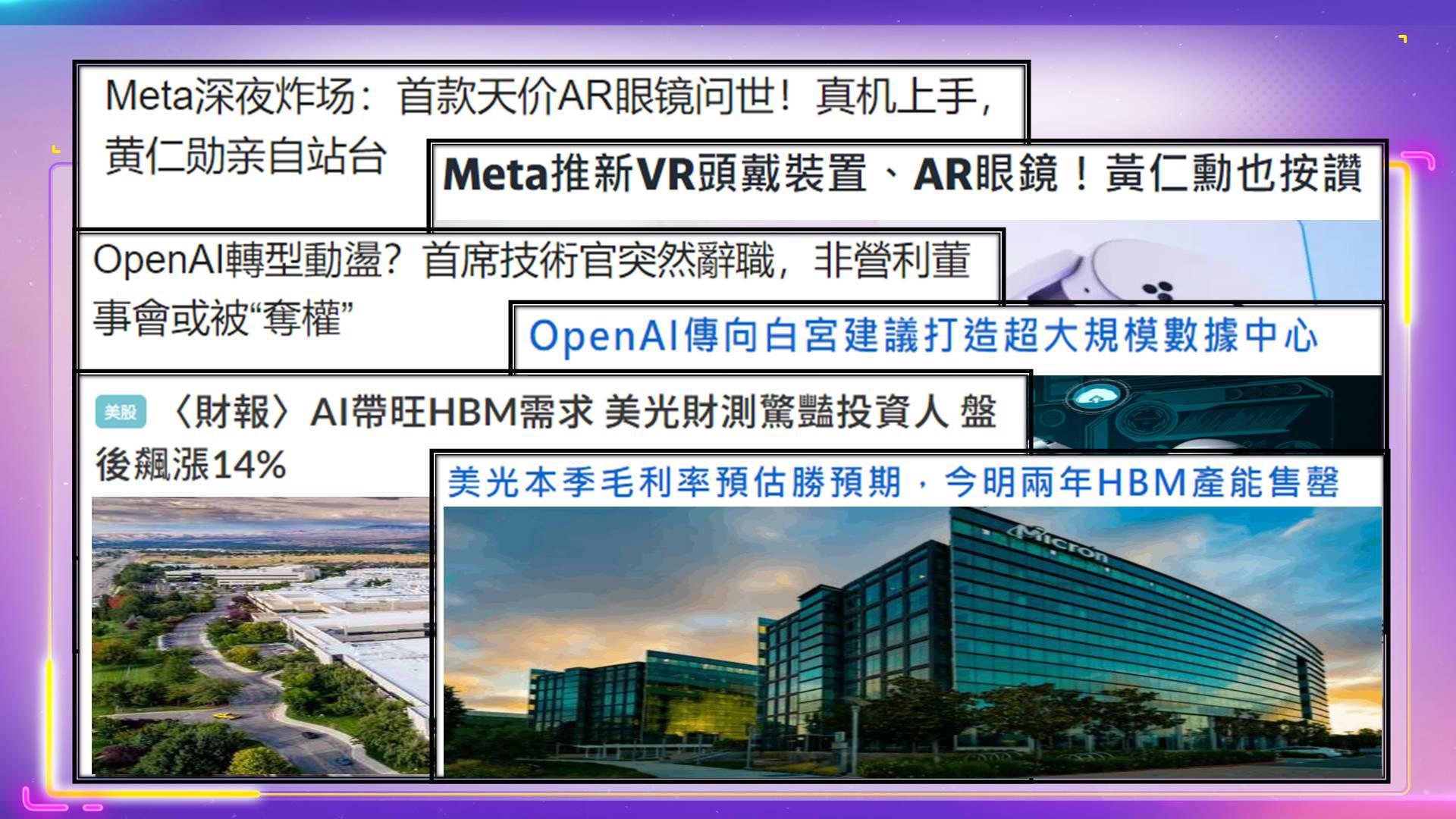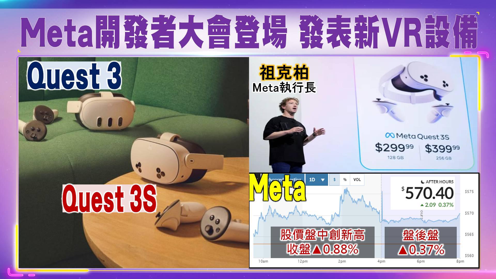 2024/09/25「Meta Connect 」年度大會,在美國登場,由執行長祖克柏發表主題演講,推出廉價版虛擬實景(VR)視像頭戴裝置Quest 3S,以及新款智能眼鏡Orion,希望增加Reality Labs的收入。輝達執行長黃仁勳也出現在大會播放的影片中,試戴最新的Orion眼鏡。因此Meta股價盤中創新高,收盤漲0.88%,盤後續漲0.37%。