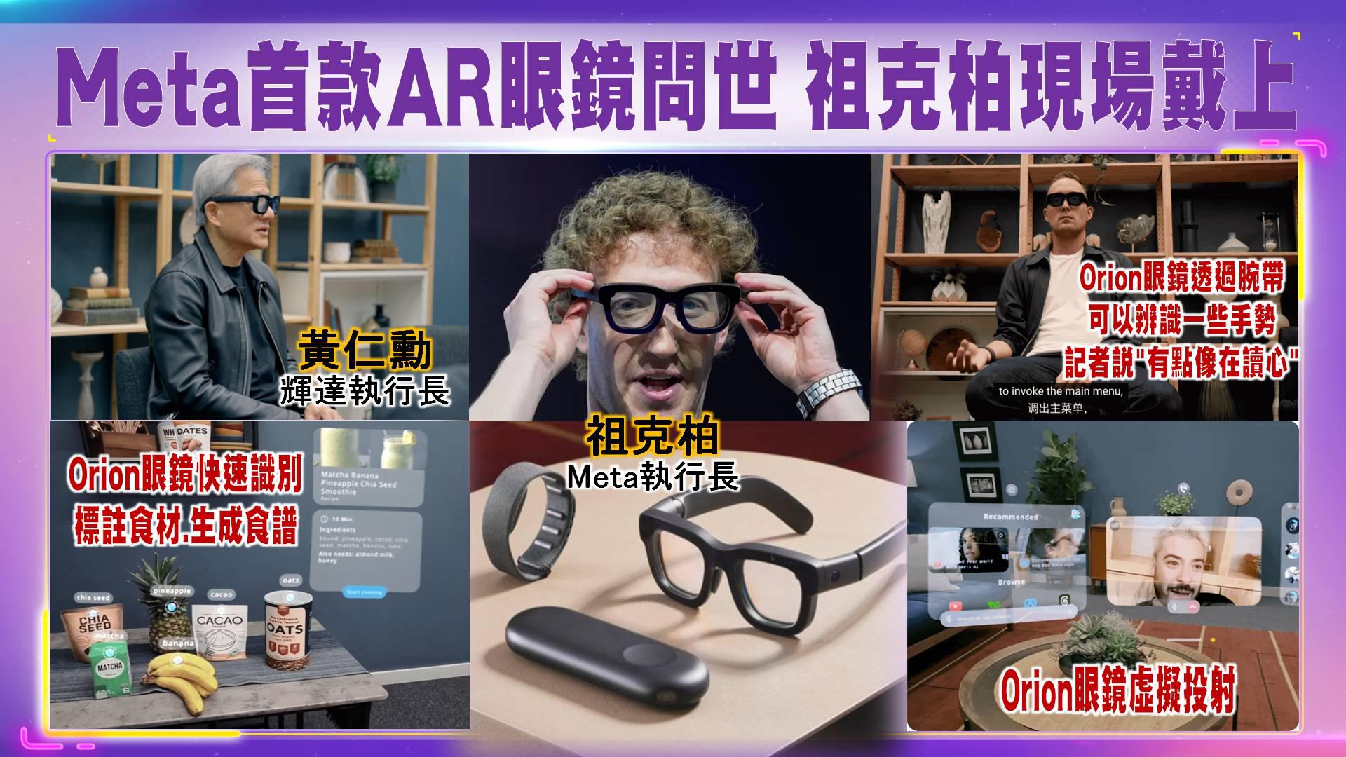 智能眼鏡Orion更配合擴增實境(AR),祖克柏:「無可挑剔」,秘密研發了十年,投入了幾十億美元,多用途電腦產品,聲稱Orion的用戶能用它玩遊戲、以多視窗執行多項任務,並透過真人化身參與全球性的視訊會議等。」
