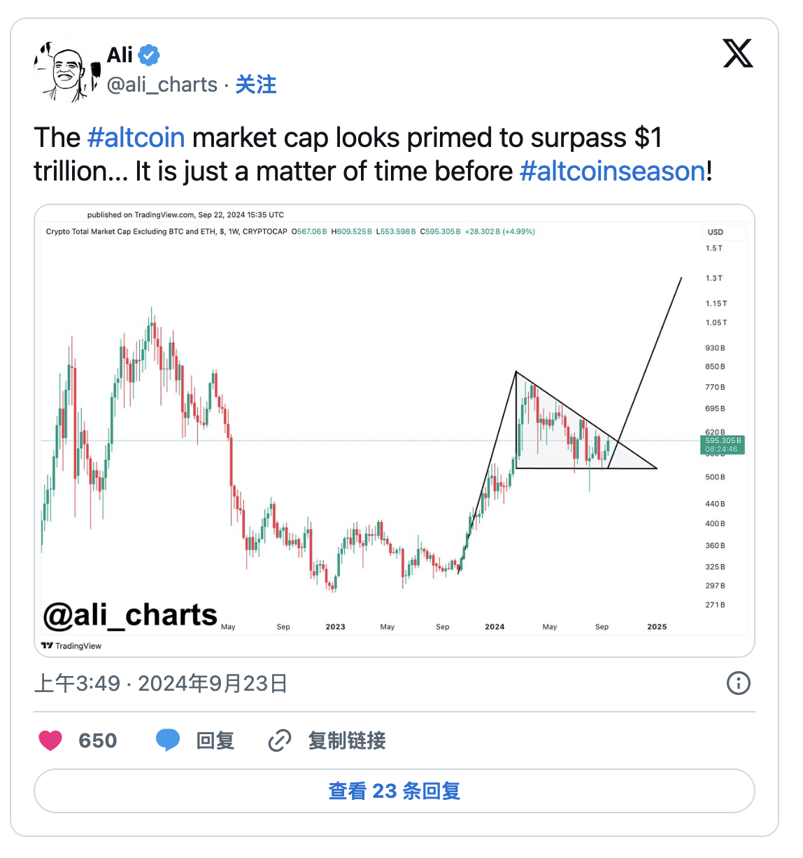 廣受關注的分析師 Ali Martinez 認為,技術面可能有所幫助。他在 X 平台的一篇帖子中寫道,觀察 TradingView 圖表,TOTAL(加密貨幣市值,不包括比特幣和以太坊)可能很快突破 1 萬億美元。