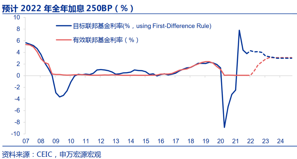 1、根據申万宏源研究測算,在外部俄烏局勢以及疫情對全球供應鏈的打擊,疊加內部就業和供需失衡,美國通膨壓降困難較大,預計目標利率在3.00%-3.25%之間。