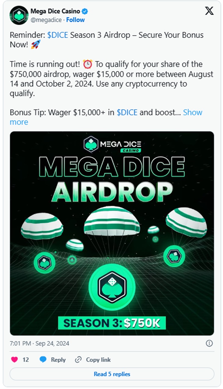Mega Dice正在加大行銷力度,通過與關鍵意見領袖(KOLs)和網紅合作,推動$DICE的廣泛採用。