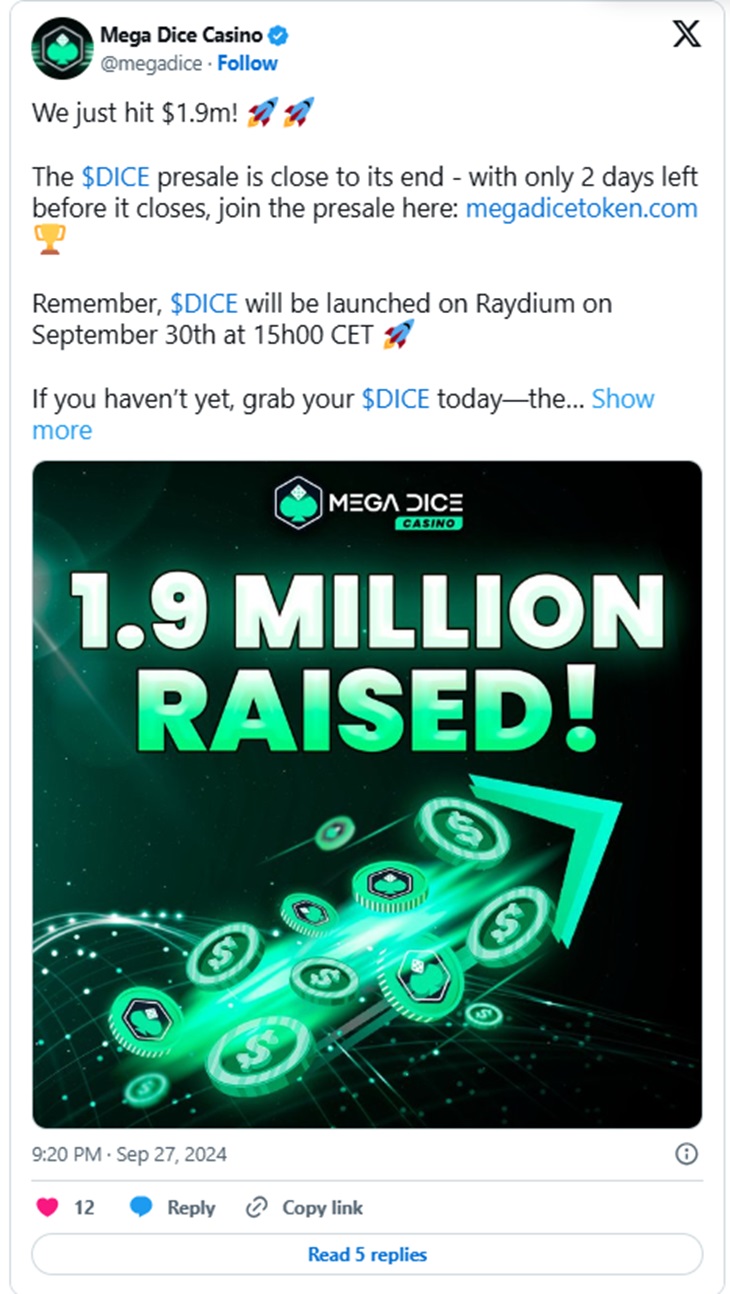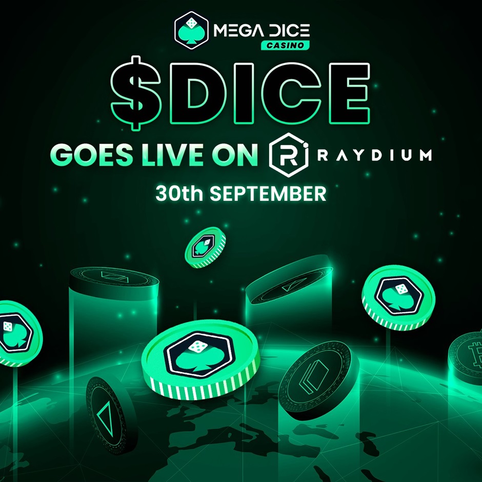 Mega Dice ($DICE) 宣佈其預售將於9月30日(中國時間9月30日晚上9時)結束,並於中歐時間15:00在Raydium上進行上線交易。