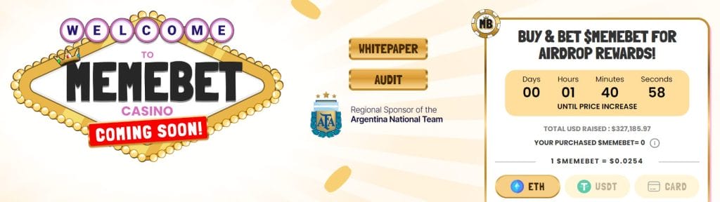 不要錯過以預售價購買 $MEMEBET 的機會!可以使用 ETH、USDT、BNB,甚至是信用卡進行購買。