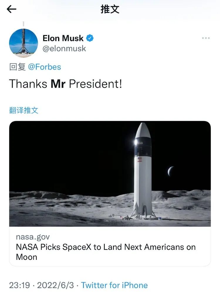 隨後馬斯克在推特轉發了拜登這條視頻,並配髮美國航空航天局(NASA)和太空探索技術公司(SpaceX)2021年合作開發商業月球登陸器的新聞稿,不甘示弱地表示“謝謝你,總統先生”。