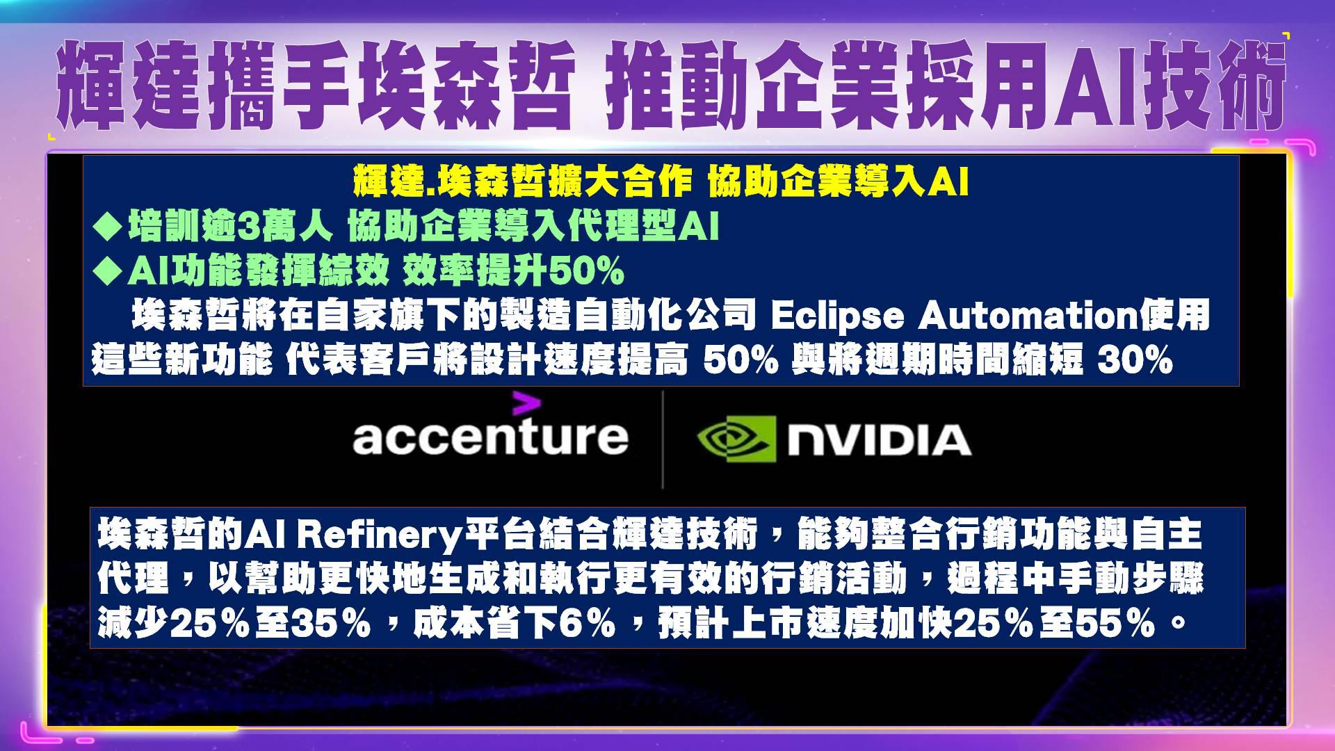 - 輝達與管理顧問機構-埃森哲(Accenture)擴大合作,為全球企業擴展代理AI。