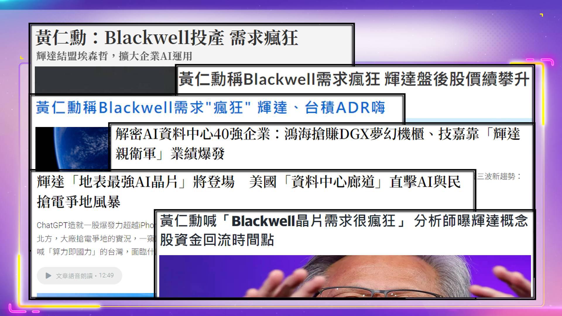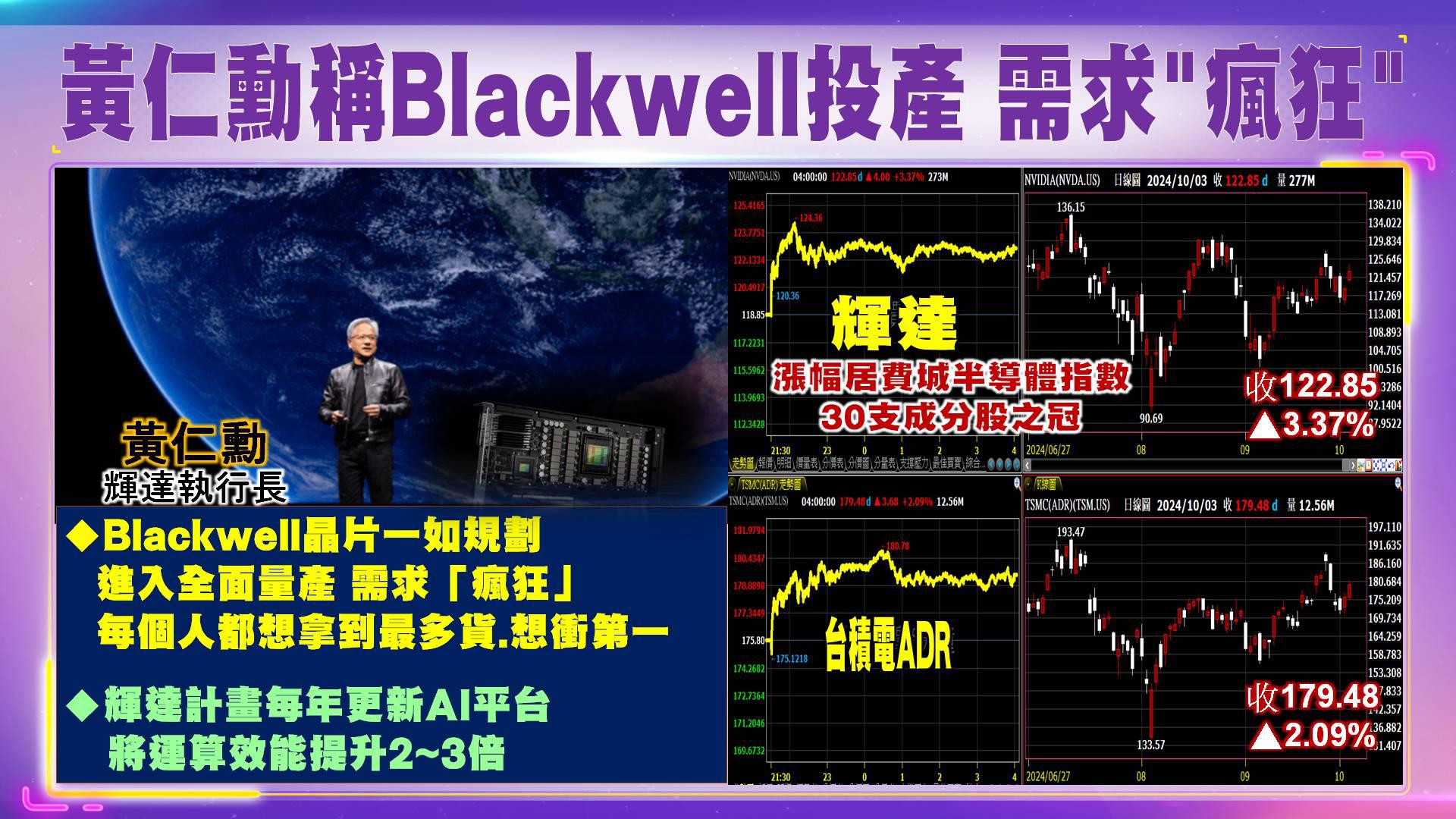 - 輝達執行長黃仁勳(Jensen Huang) 2024/10/2接受專訪,Blackwell晶片一如規劃進入全面量產,需求「瘋狂」,「每個人都想拿到最多貨、想要衝第一」。黃仁勳:科技進展速度變得這麼快,讓輝達得以押三倍賭注、驅動創新循環,藉此提升能力、產出並降低成本及能源消耗量。
