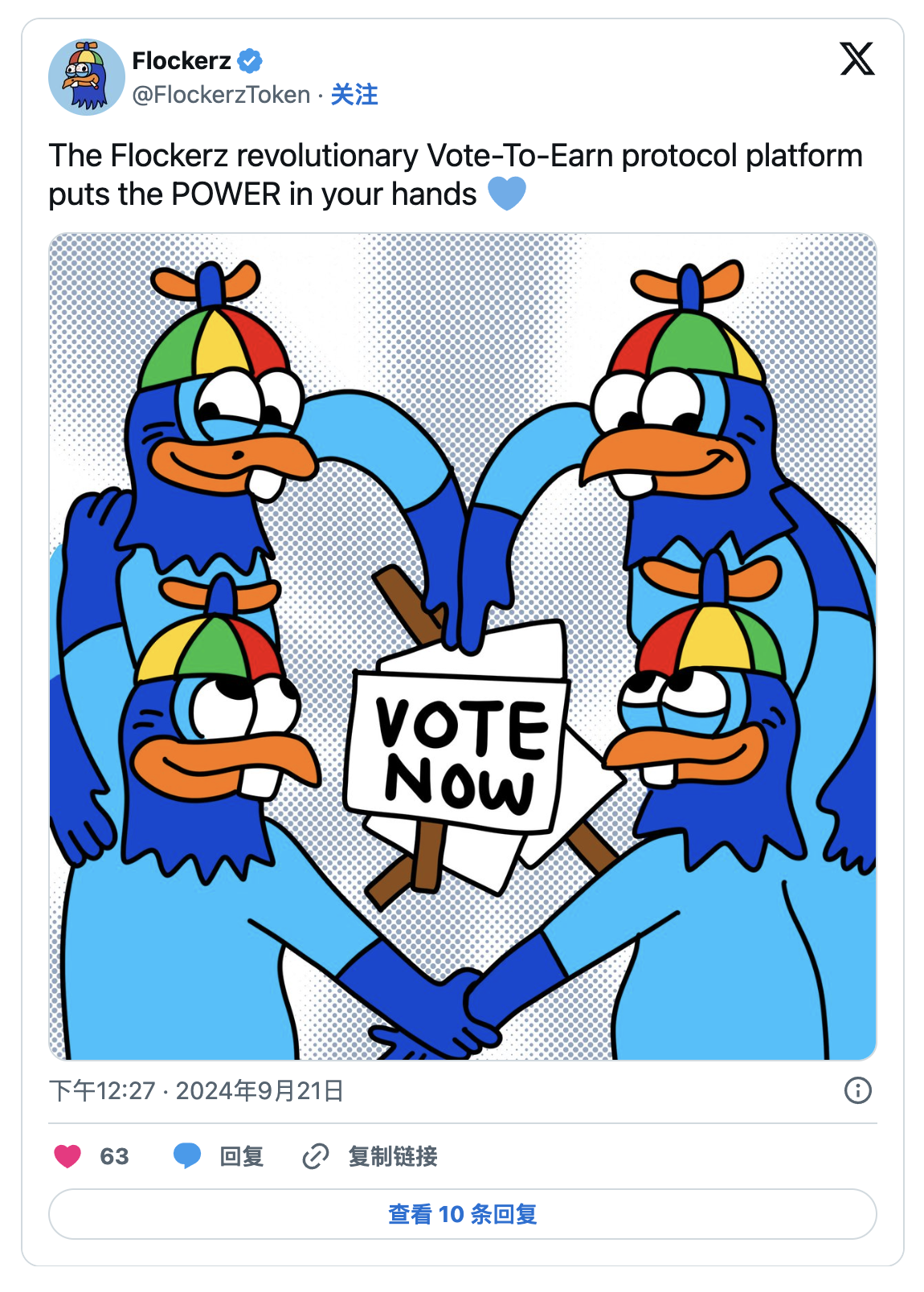 Flockerz的投票即賺概念在行業內首創,讓meme幣持有者不僅能夠參與每一個關鍵決策的投票,還能通過其原生代幣$FLOCK賺取獎勵。