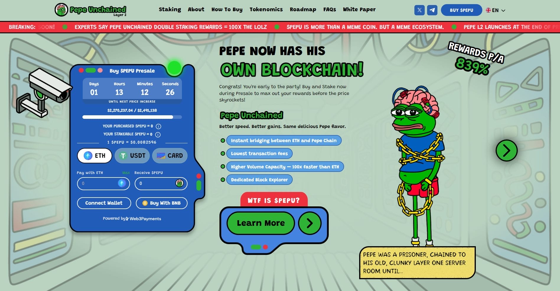 Pepe Unchained($PEPU)是一個新興的加密貨幣項目,它不僅僅是一個代幣的發行,而是對區塊鏈技術應用的全新嘗試。通過結合迷因文化和先進的Layer 2技術,Pepe Unchained 致力於為用戶提供快速、低成本的交易體驗,並建設一個功能豐富的生態系統。