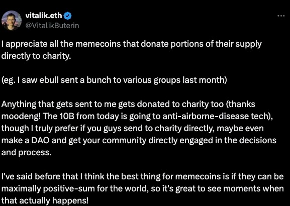 乙太坊共同創辦人Vitalik Buterin(V神)宣佈出售100億枚迷因幣Moodeng,並把大部分收益捐贈予慈善機構,MOODENG 幣價隨之飆升。