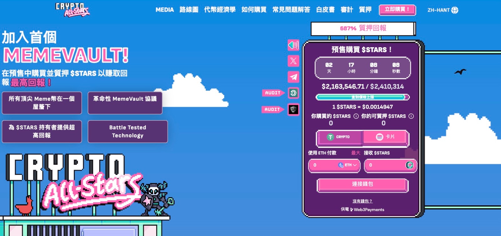 Crypto All-Stars 是一款新興的加密貨幣項目,旨在通過多鏈質押平臺 MemeVault,為投資者提供高回報的質押獎勵。該專案的亮點在於它將多個受歡迎的 Memecoin 集成到一個平臺上,投資者可以通過鎖定 Shiba Inu、Pepe、Floki Inu 等代幣,獲得 $STARS 作為質押獎勵。更令人矚目的是,質押 $STARS 可以獲得高達 900% 的年化收益率,吸引了大量加密貨幣愛好者的關注。