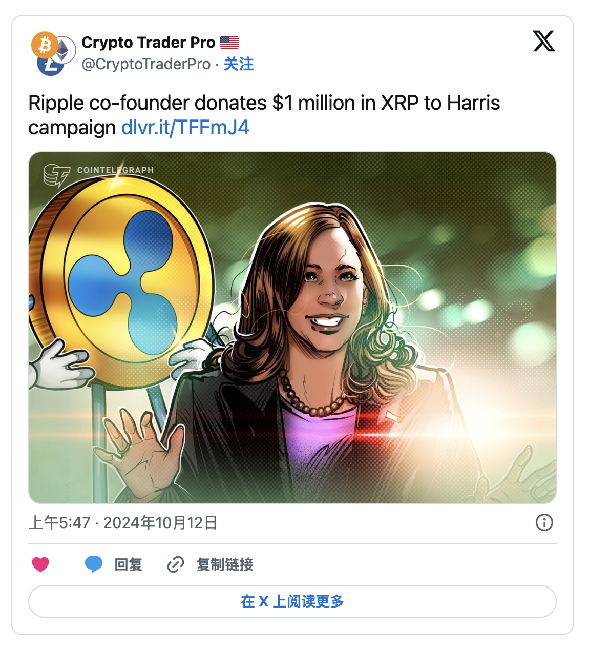 因此,Chris Larsen對哈里斯競選的巨額捐贈可能會提升XRP的市場曝光度和可信度,吸引更多機構投資者,並提振市場情緒。