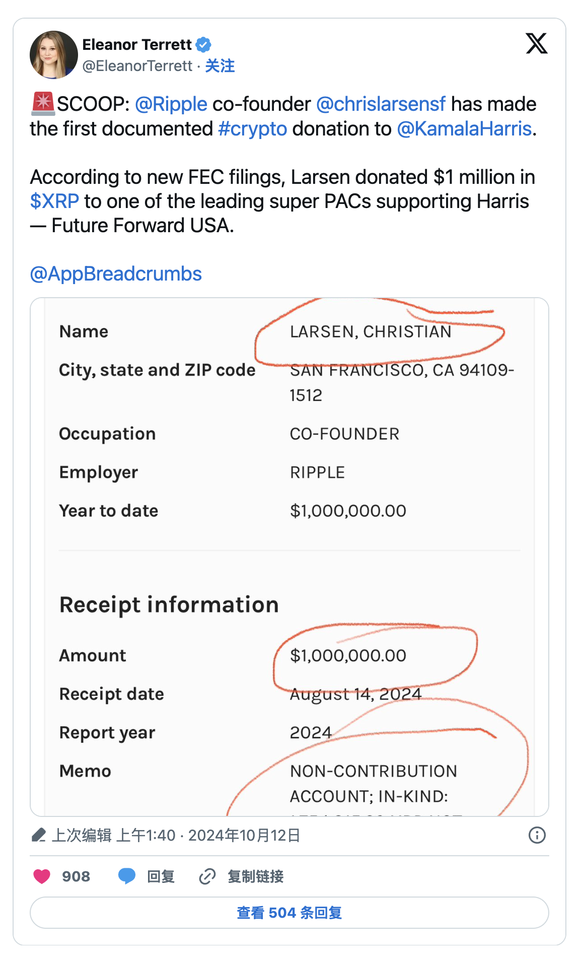 此外,XRP近期上漲還受到Ripple聯合創始人Chris Larsen向Harris-Walz 2024總統競選捐贈價值100萬美元XRP的消息推動。