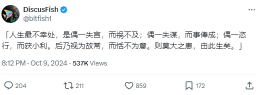 緊接着在10月9日,神魚在推特寫道:「人生最不幸處,是偶一失言,而禍不及;偶一失謀,而事俸成;偶一恣行,而獲小利。後乃視爲故常,而恬不爲意。則莫大之患,由此生矣。」