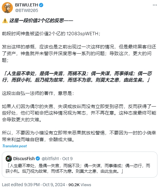 據中文幣圈意見領袖BITWU.ETH指出:「神魚被盜2億元人民幣的12083spWETH,發出這樣的感慨,應該也是之前出現過一次這樣的情況,但是最終黑客歸還了資産,神魚就并未警示并深度思考一系列的問題;導致這次,更大的問題。」