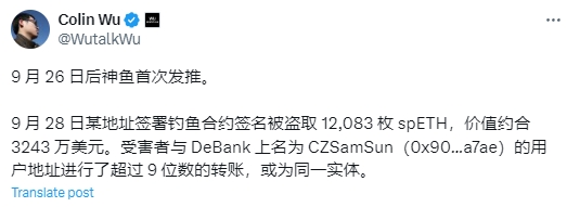 9月28日,某地址簽署了釣魚合約簽名,導致12083個spETH被盜,價值約3243萬美元。而鏈上偵探 ZachXBT發現,受害者和Debank上的czsamsun(神魚地址0x902)相互進行了9位數字的轉賬,因此很可能是同一實體。