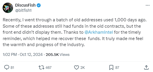 神魚在上周六(10月12日)發文也引發關注,他寫道:「最近我查看了一批1000天前的老地址,有些地址在舊合約裏還有資金,但是前端沒有顯示出來。感謝ArkhamIntel很及時的提醒,幫我追回了這筆款項,讓我真切感受到這個行業的溫暖和進步。」