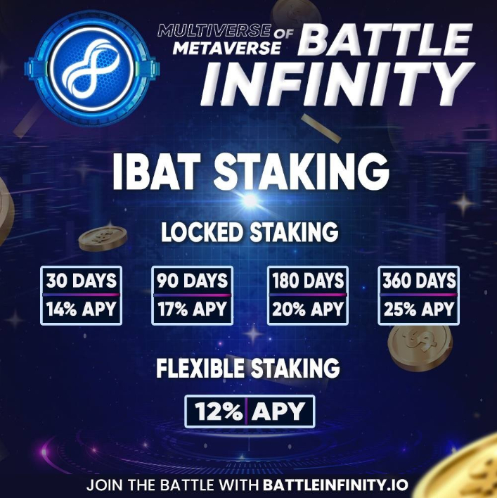 Battle Infinity 已證明它是最好的質押平台之一,因為它支持靈活的質押 – 投資者可以選擇鎖定代幣的時間並賺取高達 12% 的年利率。全球質押池還將 IBAT 代幣分發給最活躍的玩家們。