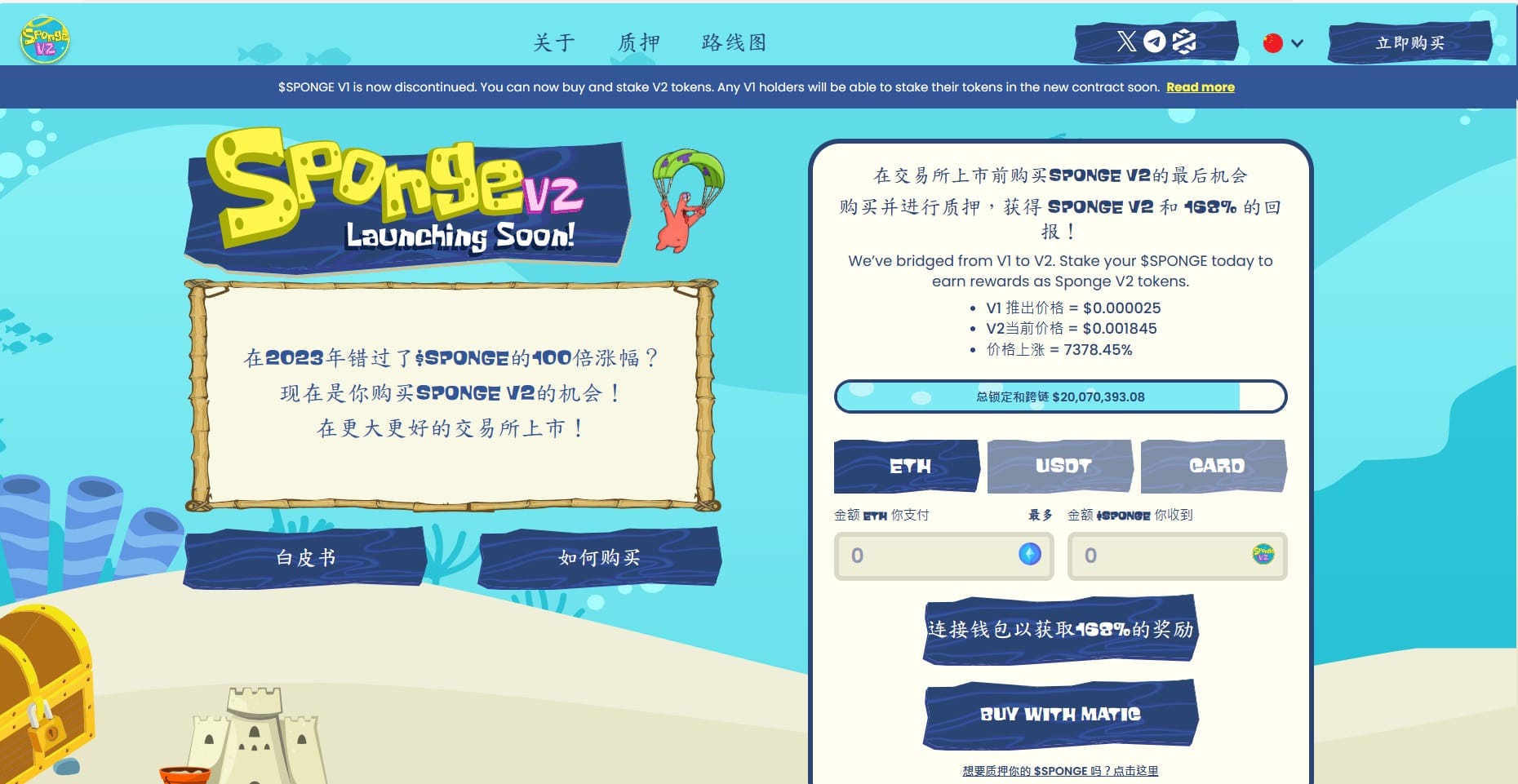 Sponge V1的成功故事為Sponge V2的推出奠定了堅實基礎。在2023年,Sponge V1作為當年最熱門的模因幣之一,其市值從百萬美元飆升至十億美元,為投資者帶來了巨大的收益。現在,Sponge V2通過其創新的質押和跨鏈機制吸引了大量資金,網站上的總質押價值已接近3000萬美元,其中包括來自多條區塊鏈的資金。
