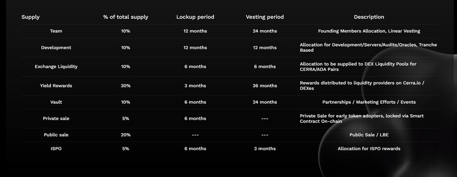 Cerra 是卡爾達諾區塊鏈上的 DeFi 平台。CERRA 代幣持有者是平台的“所有者”,他們透過質押賺取平台利潤的一部分。如果該平台表現良好,這可能是一個可靠的被動收入機會。