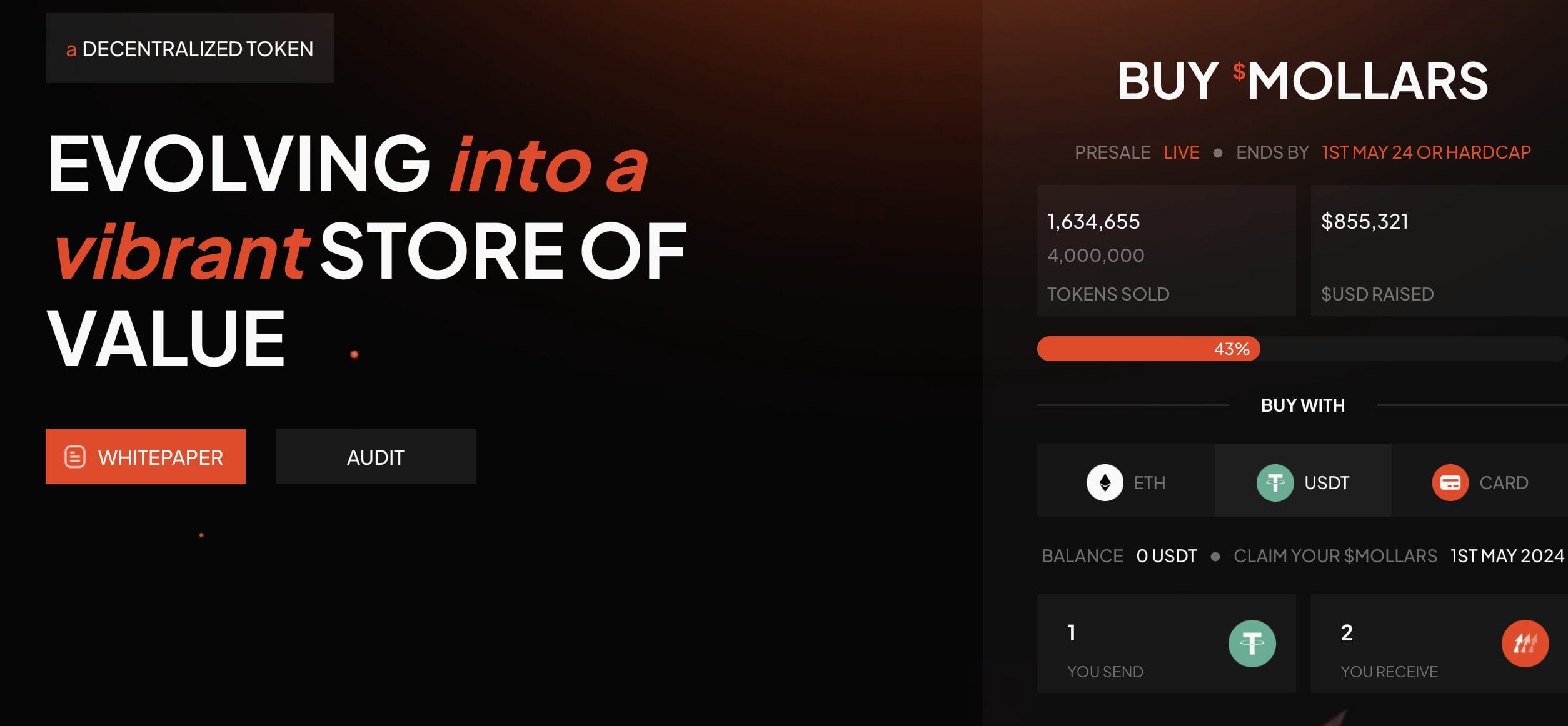 在撰寫本文時,$MOLLARS 代幣的預售價格僅為 0.5 美元。自預售開始以來,該項目已籌集超過 85 萬美元。從 1000 萬個代幣供應中,分配 400 萬個代幣預售。