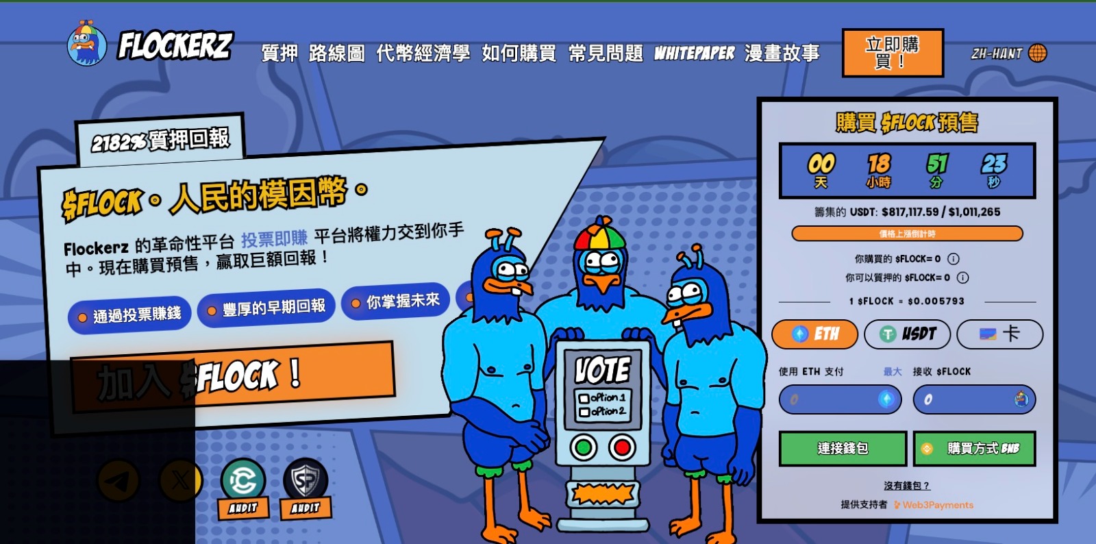 Flockerz ($FLOCK) 是當前最受關注的低調ICO之一。作為一個完全去中心化的專案,Flockerz 讓代幣持有者能夠參與項目治理,包括投票決定代幣銷毀、行銷計畫以及新功能開發等關鍵事項。這個平臺的核心理念是通過投票參與治理的持幣者,將獲得 $FLOCK 代幣的獎勵,這一創新的機制吸引了眾多投資者的關注。