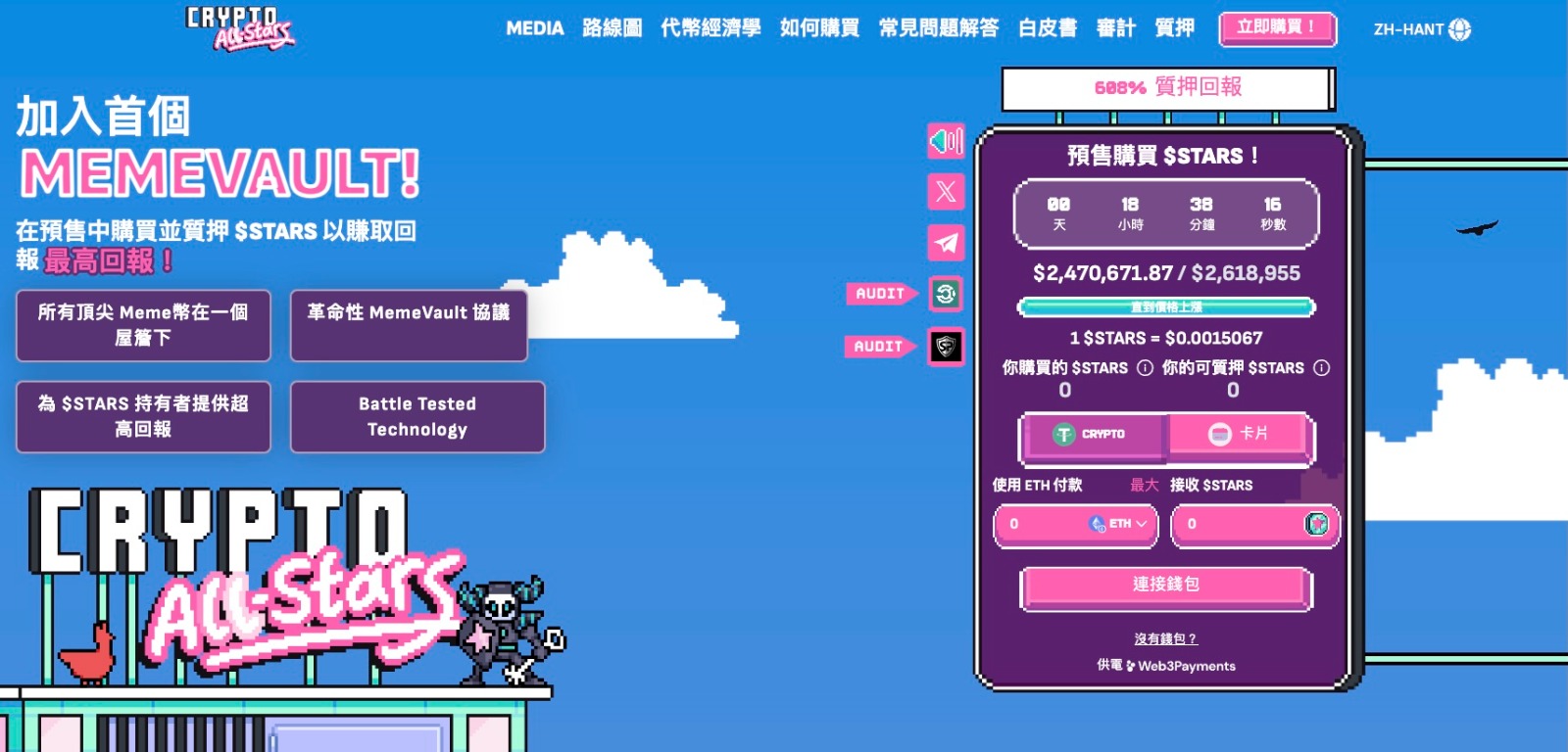 Crypto All-Stars 的代幣經濟學也設計得相當平衡,預售階段分配了20%的代幣,質押獎勵分配了25%。目前,該項目在預售中已籌集近250萬美元,早期投資者有機會在其MemeVault啟動後獲得更高的回報。 $STARS 代幣目前的價格為0.0015067美元,並可通過ETH、USDT等多種代幣購買。