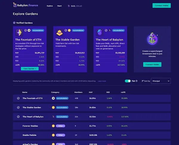Babylon Finance 是另一個專注於鏈上主動式資產管理的項目。具體來說,Babylon 專注於社區治理的資產管理。用戶可以創建“花園”(投資社區),然後由其成員共同管理。