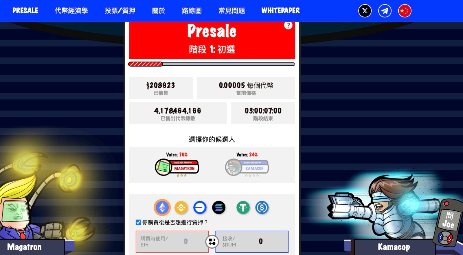 該專案為加密投資者提供了一種輕鬆的方式來觀察美國選舉,渴望見證 MAGATRON 與 Kamacop 9000 之間激烈對抗的人們可以通過以僅 0.00005 美元的價格購買項目的原生代幣 $DUM 參與 FreeDum Fighters 的預售。