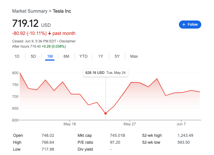 隨著投資者紛紛開始尋求避險,過去兩年領漲股市的科技類股成為了下挫最慘重的板塊。特斯拉股價次日就暴跌了8%,隨後更從952美元一路狂瀉到5月24日的625美元,市值蒸發了三分之一。雖然過去兩週緩慢回升到目前的725美元價位,但距離今年4月初的1145美元依然有巨大差距。