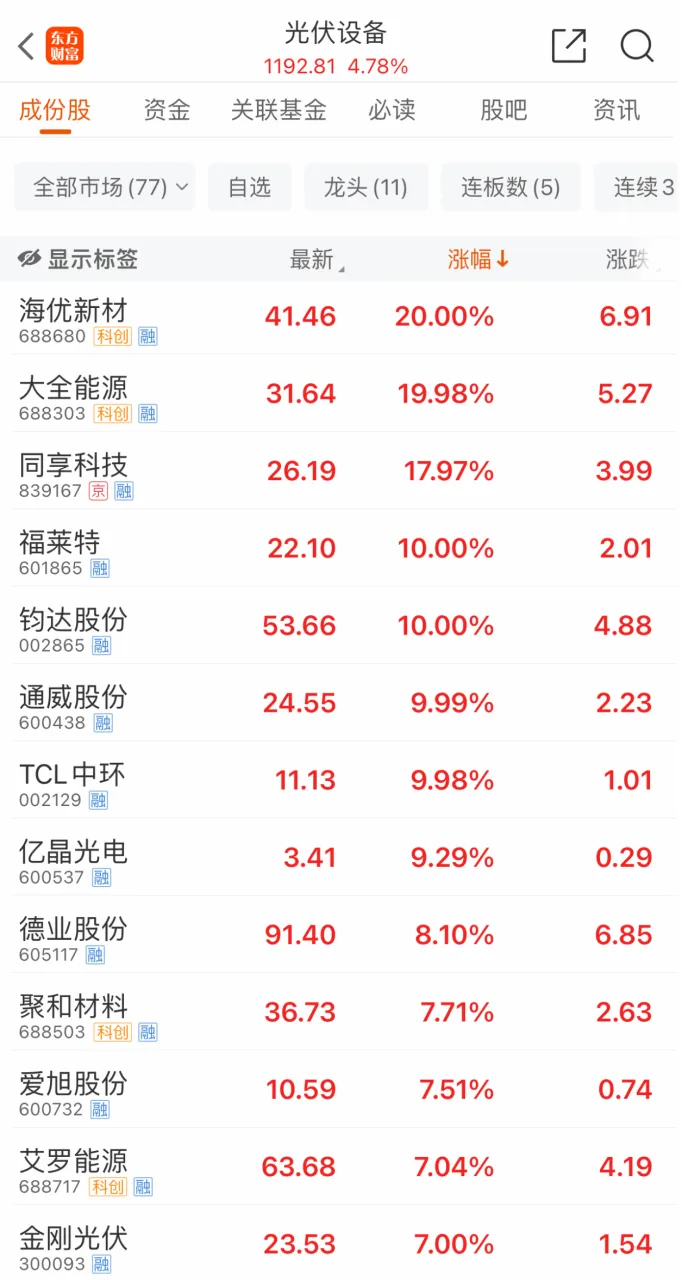 今日午後,A股光電概念股全線飆漲,光電設備指數一度大漲超7%,截至收盤,漲幅仍達4.78%。其中,隆基綠能盤一度觸及漲停,最終收漲6.53%,海優新材、大全能源斬獲20CM漲停,同享科技漲近18%,鈞達股份、通威股份、寶馨科技、TCL中環等多股漲停。