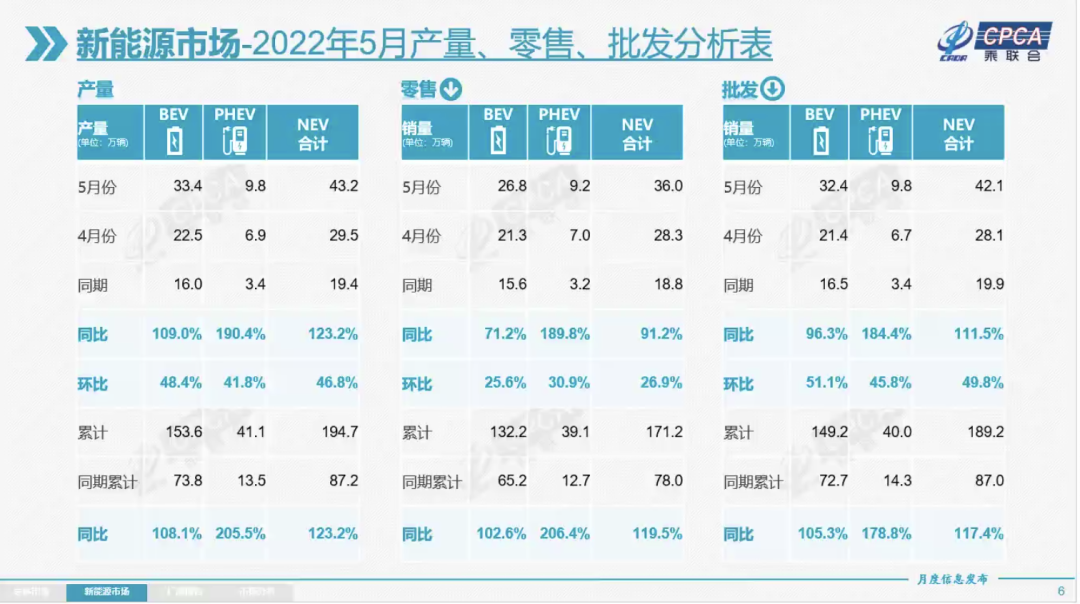 崔東樹表示,自主車企於5月份全面發力,表現出強勢姿態,正在“全面佔據主力地位”。而在新能源市場,共有13家新能源廠商的月批發銷量過萬。5月新能源乘用車批發銷量達到42.1萬輛,同比增長111.5%,環比增長49.8%,零售銷量達到36.0萬輛,同比增長91.2%,環比增長26.9%。