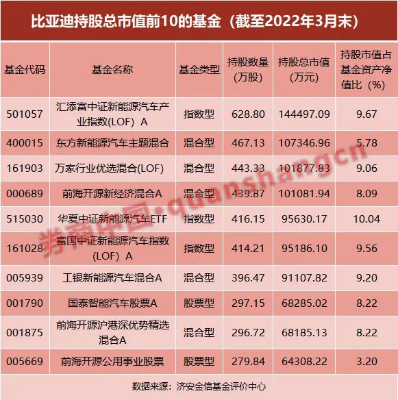 具體來看,濟安金信基金評價中心從兩個維度分析持有比亞迪的“鐵桿粉絲”,一個是持股市值占基金資產淨值比超過10%的基金,一個是持股總市值前10的基金。