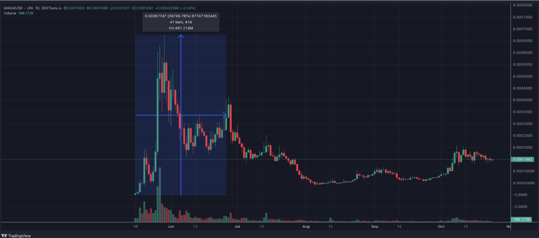 表現優異的特朗普幣Maga Hat ($MAGA) 於5月在以太坊鏈上推出,最高為買家帶來了287倍回報,而基於Solana的TRUMP於3月推出,買家在初始上市價買入時獲得了554倍的增長。