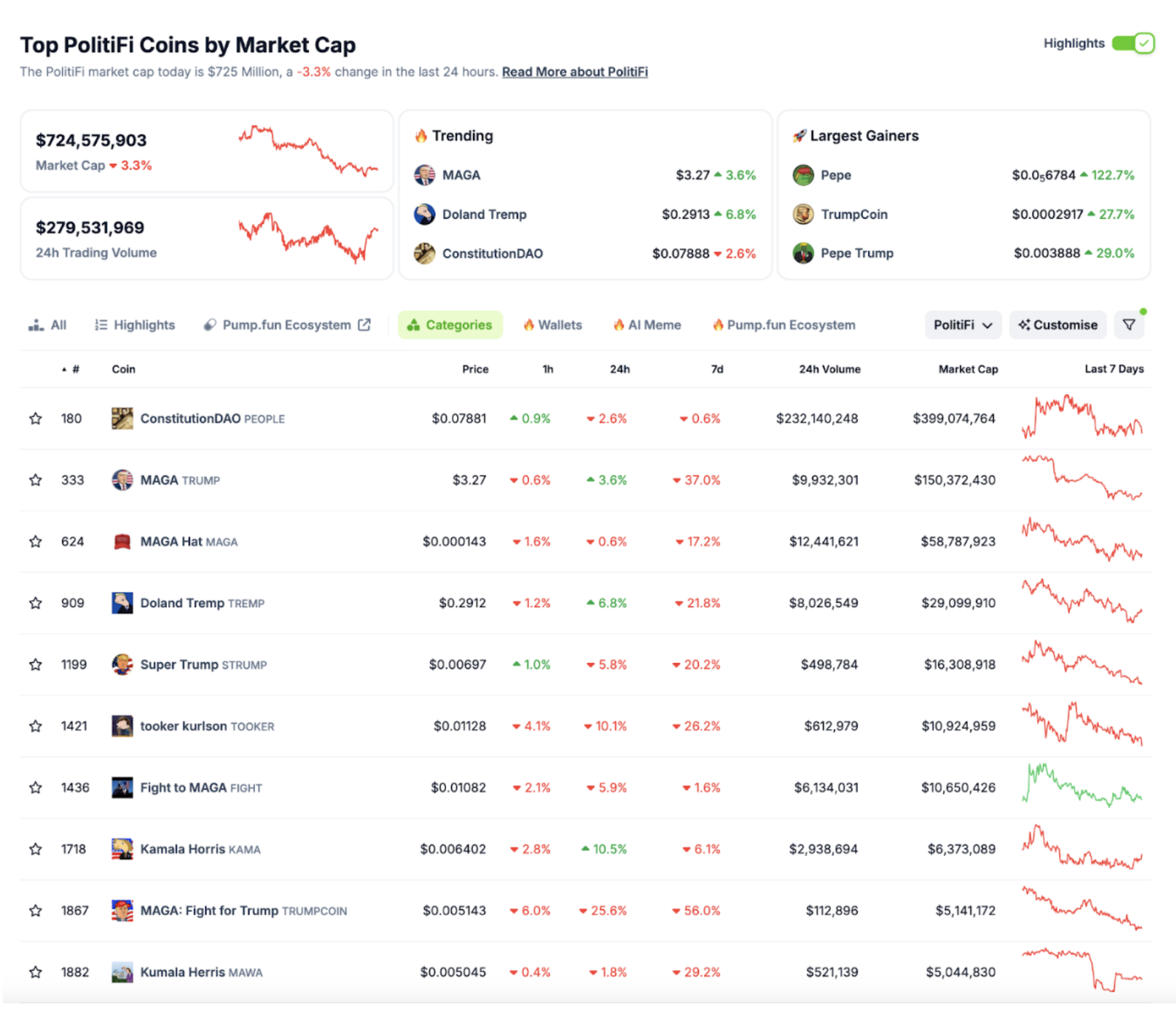 PolitiFi幣的整體市場價值已膨脹至7.24億美元,24小時交易量達到2.79億美元。