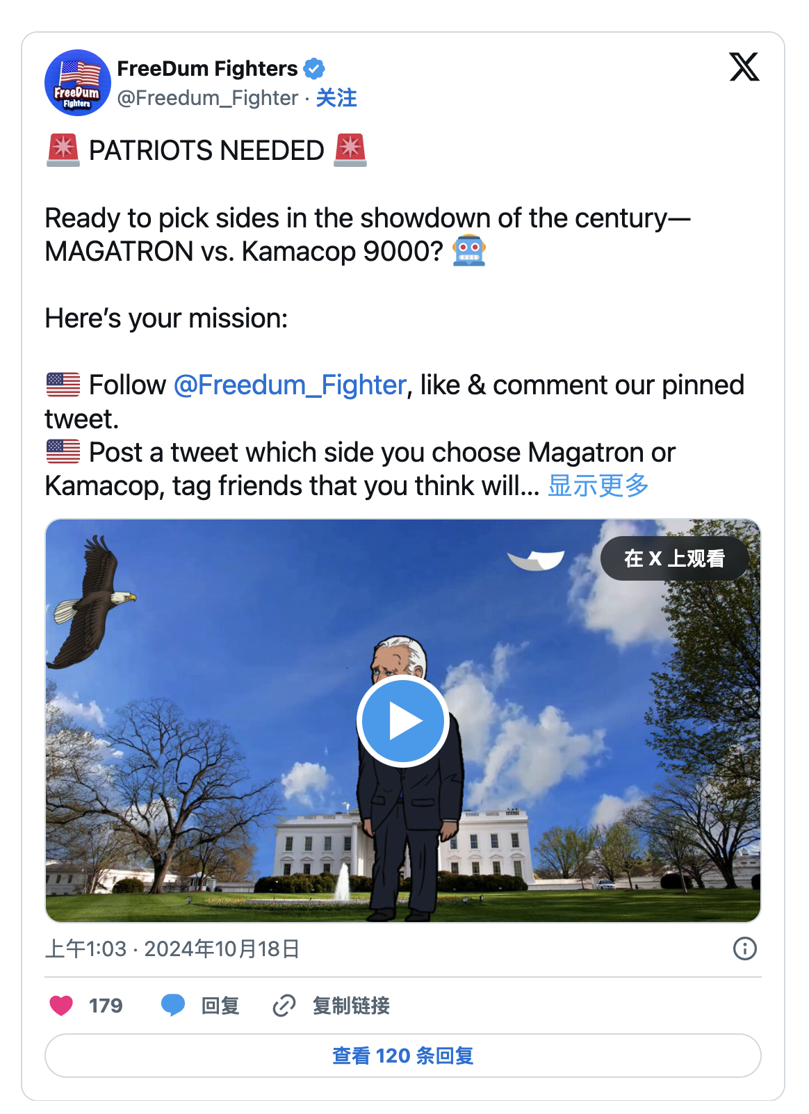 在FreeDum Fighters的戰場上,前美國總統唐納德·特朗普(Donald Trump)化身為觸手怪MAGATRON,副總統卡馬拉·哈里斯( Kamala Harris)則變成了機械超級英雄“卡瑪警探9000”(Kamacop 9000)。這兩個角色已經吸引了加密社群中最關注政治的受眾。
