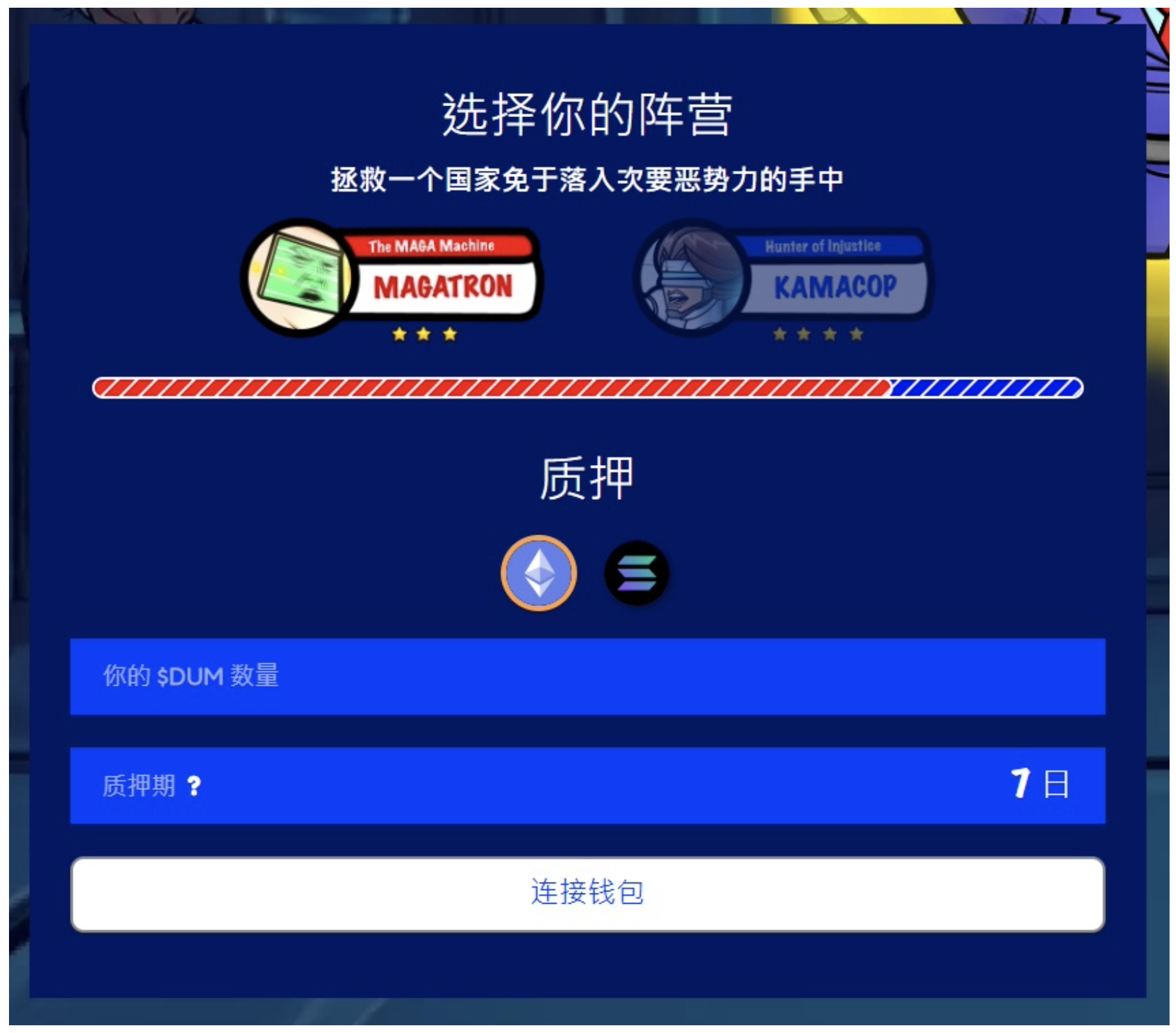 在FreeDum Fighters中,特朗普似乎也表現優於哈里斯。儘管卡瑪警探9000(Kamacop 9000)的年收益率(APY)高達1,762%,是MAGATRON的4倍(408%),但仍有超過四分之三的選民支持MAGATRON而非KAMACOP。用戶可以選擇在以太坊或Solana上進行質押。