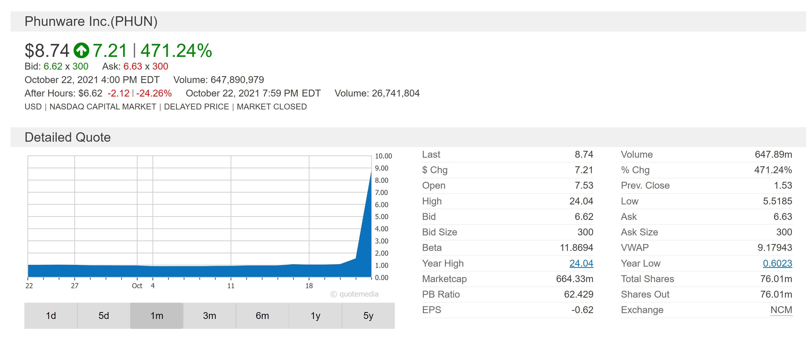 週五還有一隻川普概念股暴漲,Phunware一度暴漲1400%。 週四、週五兩個交易日,已經上漲733%。
