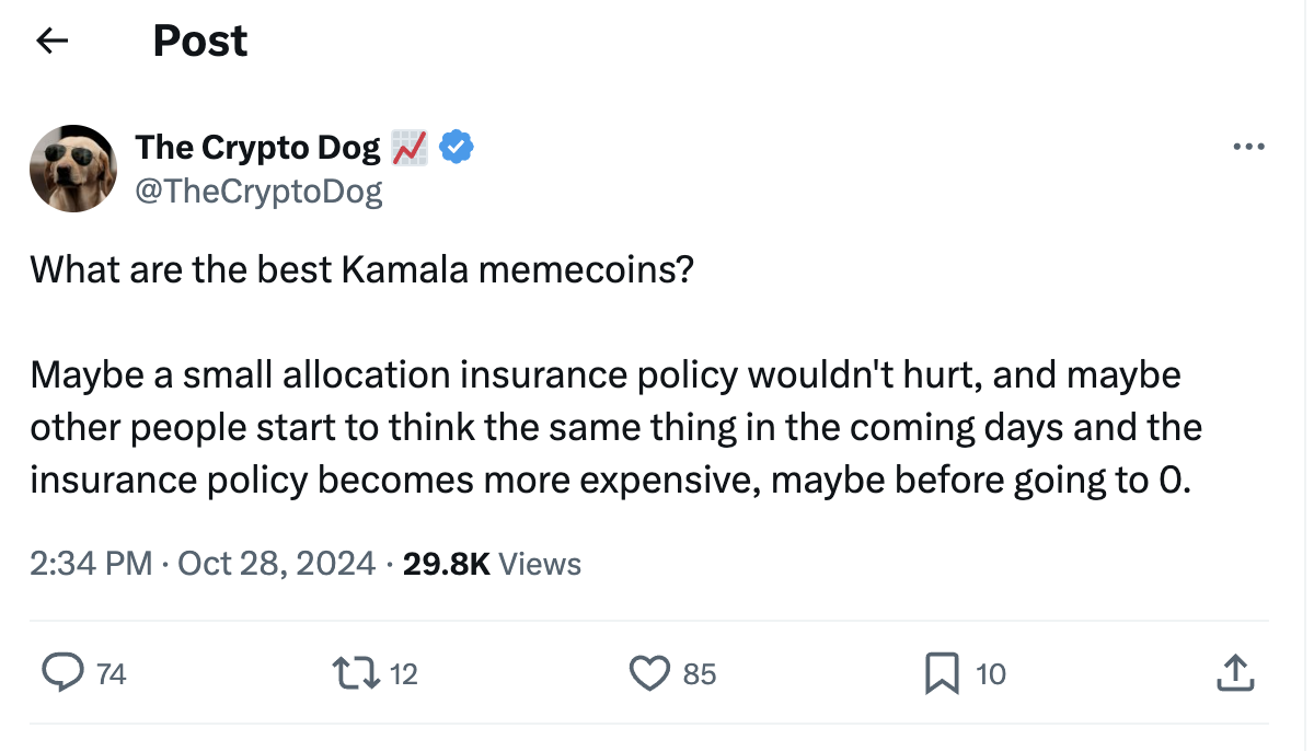 這或許正是為什麼X平台上最具影響力的加密貨幣意見領袖之一 The Crypto Dog 建議,投資與哈里斯相關的代幣可能是對抗川普在加密領域主導地位的明智對沖,尤其是在基於 Polygon 的預測平台 Polymarket 上。