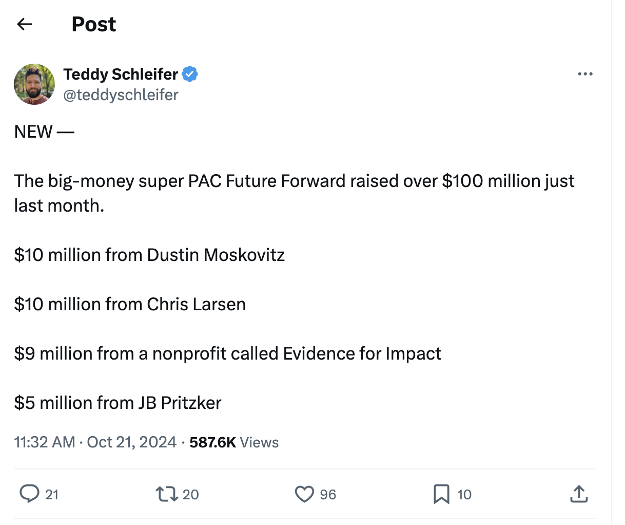 此外,支持哈里斯的超級政治行動委員會 Future Forward 還籌集了1億美元,其中包括來自科技領袖達斯汀·莫斯科維茨和伊利諾伊州州長 J.B. 普里茨克的捐款。